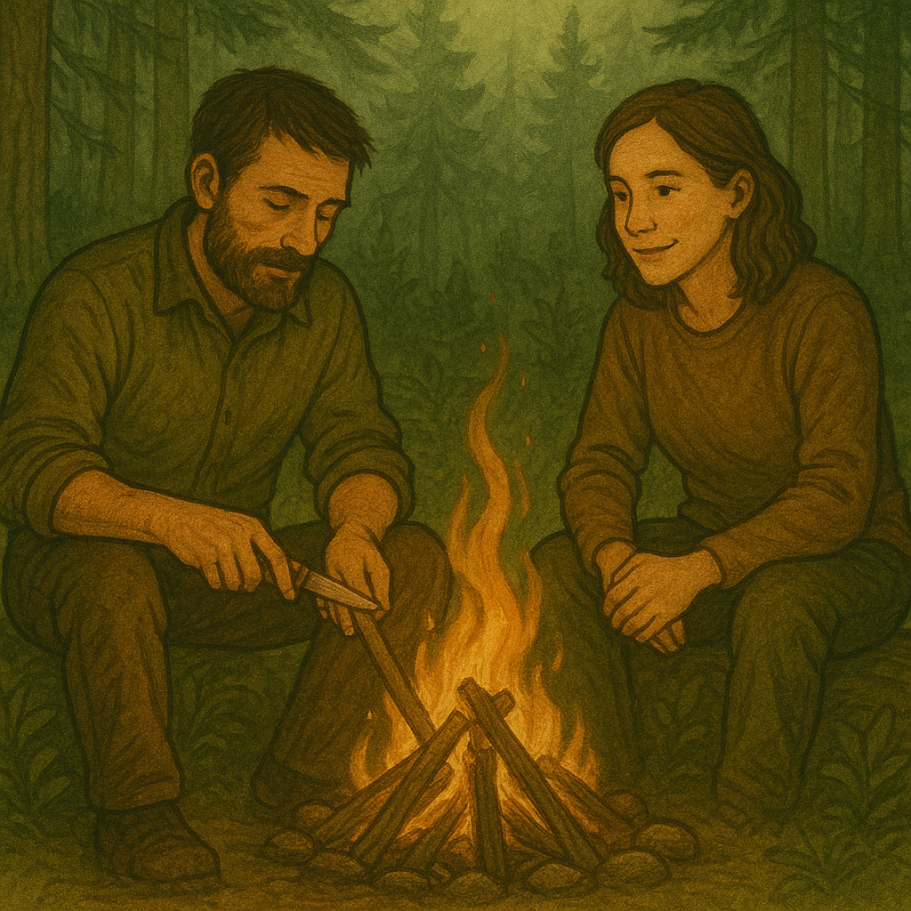 An meinem Ort im Wald können wir Feuer machen, schnitzen, mit Axt, Säge oder Feuerstahl arbeiten und das Camp gestalten. Diese einfachen Tätigkeiten bringen oft mehr Klarheit als jedes Coachinggespräch im Raum. Die Elemente, der Wind, das Feuer, die Stille – all das holt dich raus aus dem Kopf und zurück zu dir.